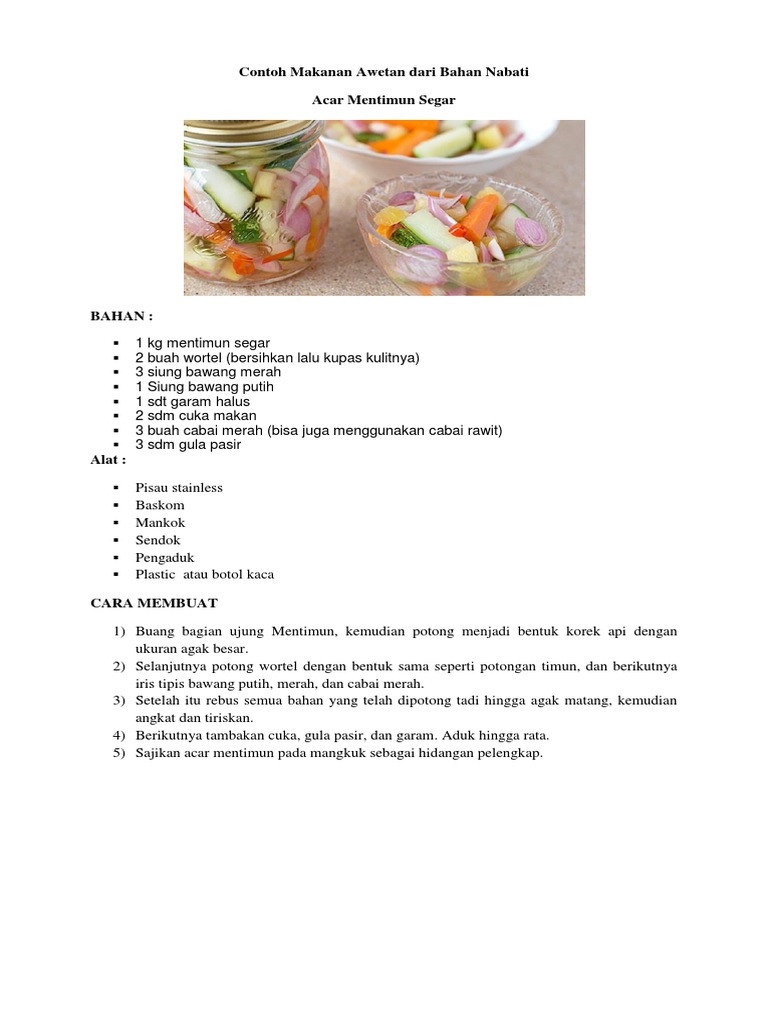 Pengawetan bahan pangan yang pada umumnya bahan pengawet digunakan untuk memperpanjang masa simpan produk pangan. Makanan awetan saya akan mencoba menjawab pertanyaan ini dengan dua jawaban. 10 contoh makanan awetan dari bahan nabati. Tugas makalah tentang pengolahan makanan awetan dari bahan pangan nabati. Pemakaian cuka menciptakan cita rasa dari acar tersebut menjadi asam. Sedangkan bahan pangan hewani adalah bahan makanan yang berasal dan diolah dari hewan.