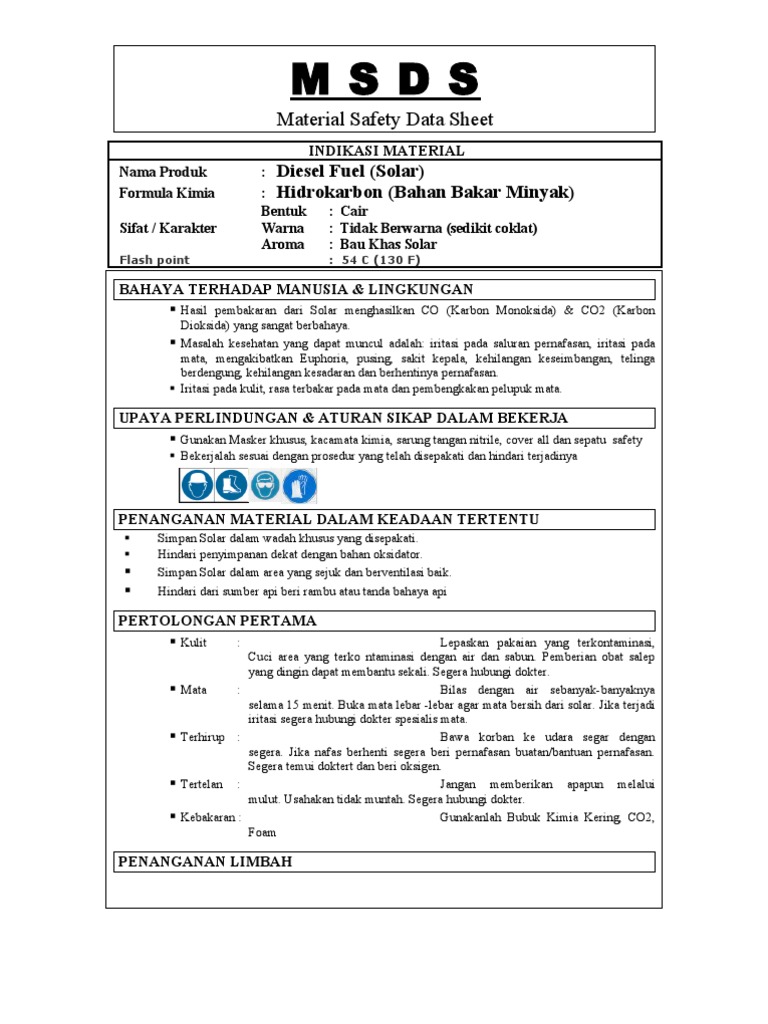 Indonesia memiliki beberapa regulasi yang terkait dengan material safety data sheet atau lembar data keselamatan bahanperaturan pemerintah republik indonesia nomor 74 tahun 2001 tentang pengelolaan bahan berbahaya dan beracun menyebutkan tentang kewajiban adanya msds atau ldkb untuk beberapa aktivitas terkait dengan bahan berbahaya dan beracun. Msds material safety data sheet atau juga dalam bahasa indonesia ldkb lembar data keselamatan bahan merupakan dokumen yang wajib disertakan pada setiap bahan kimia yang didistribusikan pada industri atau konsumen tertentulembar ini penting sebagai panduan bagi pengguna bahan agar memahami sifat sifat bahan kimia dan cara penaggulangan apabila terjadi bahaya. Identifikasi senyawa tunggal atau campuran alpha sp 460 produsen pemasok pt. Academiaedu is a platform for academics to share research papers. Lembar data keselamatan bahan material safety data sheet identitas nama produk berdasarkan ghs 1. Product identifier other means of identification section 1.