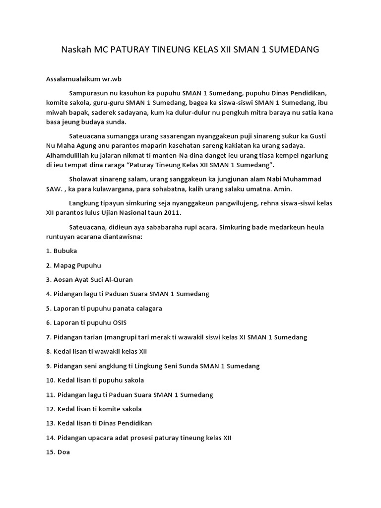 Aku mc dangdut plus pop sunda tpi teu tiasa ngemsi ku bhsa indohyong anu paten acara bubuka kanggo dangdut d panggung hajatanmanawi tiasa ngabantos bde nyuhun kn elmu na. Pengertian mc selengkapnya dapat dibaca pada artikel berikut. Contoh teks mc pembawa acara perpisahan sekolah dengan bahasa sunda embara kabalarea bewara kanu araya kanca baraya nu pada lengah sugri pribumi nu pada linggih mugia mugi janten uninga wirehing dina dinten ieu pisan kemis 11 juni 2019. Sman 1 sumedang juni 2013. Contoh mc perpisahan dalam bahasa sunda panumbu caturmc paturay tineung kelas xii sman 1 sumedang.
