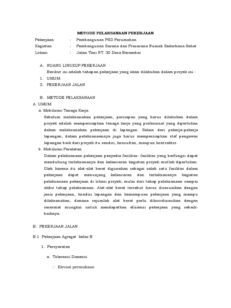 Contoh metode pelaksanaan pekerjaan jalan. Contoh metode pelaksanaan pekerjaan jalan raya slideshare uses cookies to improve functionality and performance and to provide you with relevant advertising. If you continue browsing the site you agree to the use of cookies on this website. Lingkup pekerjaan pekerjaan ini mencakup semua kegiatan mobilisasi peralatan dan personil yang di perlukan dan semua falitas pendukung selama dalam masa pelaksanaan pekerjaan serta melakukan demobilisasi kembali terhadap semua terhadap semua peralatan dan personil pada saat pekerjaan selesai. Pekerjaan ini harus meliputi pemasokan pengangkuatn penghamparan dan pemadatan bahan untuk pelaksanaan lapis pondasi jalan tanpa penutup aspal dan suatu lapis permukaan sementara pada permukaan tanah dasar atau lapis pondasi bawah yang telah disiapkanpemasokan bahan akan mencakup jika perlu pemecahan pengayakan pencampuran dan operasi operasi lainnya yang diperlukan untuk memperoleh. Metode pelaksanaan pekerjaan mobilisasi 1. Untuk paket pekerjaan ini pemerintah menganggarkan dana dengan nilai hps sebesar rp 7165800000 tujuh milyar ser atus e nam puluh lima juta delapan ratus ribu rupiah dengan target panjang pekerjaan sepanjang 2700 m 27 km dengan jangka waktu pelaksanaan selama 1 8 0 seratus delapan puluh hari kalender dan jangka waktu pemeliharaan selama 360 tiga ratus enam puluh hari kalender.