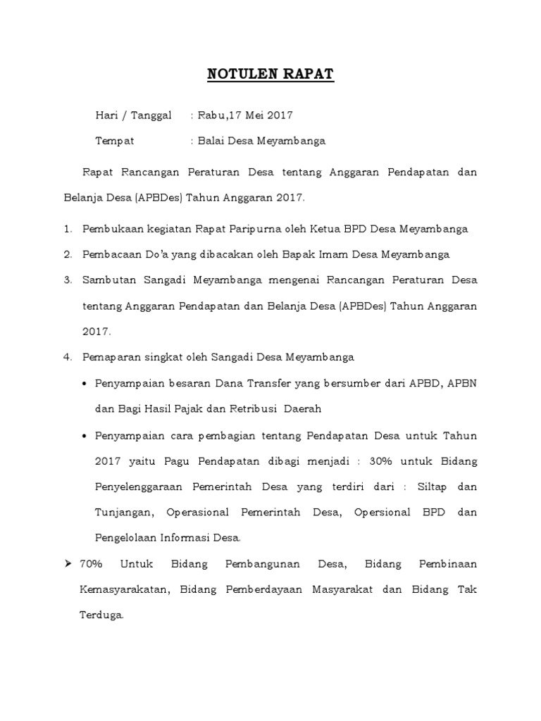Contoh notulen rapat desa. Seperti kantor rapat desa karang taruna rapat bem rapat osis rapat perusahaan rapat kerja rapat dinas dan lain sebagainya. Notulen merupakan suatu catatan yang biasanya ada dalam forum diskusi rapat organisasi rapat kantor rapat sekolah dan lain sebagainya. Berikut ini beberapa contoh notulen rapat yang akan dijabarkan. Contoh notulen yang benar untuk anda yang terbiasa melakukan kegiatan berorganisasi seperti seminar diskusi maupun rapat tentu sudah tidak asing lagi dengan yang namanya notulen dan berita acaraunuk masalah berita acara rapat sudah pernah kita bahas di postingan sebelumnya oleh sebab itu kali ini kita akan membahas cara membuat notulen yang baik dan benar. Contoh salinan notulen berita acara rapat bersama bpd dan pemerintah desa perihal pembahasan dan persetujuan rancangan perdes pendirian bumdes silahkan cek preview berikut ini. Contoh notulen rapat musyawarah desa dimana biasanya akan digunakan ketika sudah menyusun pemerintahan atau perangkat desa dimana saja.
