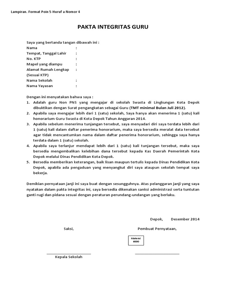 Pelaksanaan tugas tambahan yang melekat pada pelaksanaan kegiatan pokok sesuai dengan beban kerja guru. Contoh surat pakta integritas untuk guru pnsnon pns yayasan. Itulah contoh contoh surat pakta integritas yang formal dan tepat sebagai referensi untuk anda dan dapat didownload secara gratis tanpa harus daftar terlebih dahulu. Contoh surat pakta integritas yang. Berkomitmen untuk mewujudkan visi dan misi pendidikan. Bila pakta integritas di langgar sebab jika tidak dicantumkan sangsinya maka percuma saja membuat pakta integritas hanya memboroskan tenaga pikiran dan lain lain.