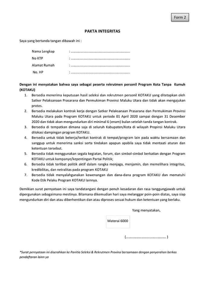 Pegawai negeri sipil pusat 2. Pakta integritas merupakan sebuah bentuk dokumen yang berisi tentang pernyataan perjanjian secara bersama atau dapat disebut sebagai komitmen dalam bentuk kesanggupan patuh terhadap ketentuan yang berlakudalam hal ini list kerja hanya menerangkan sedikit penjelasan dan juga beserta contoh pakta integritas sebagai acuan untuk anda saat diperlukan. Sebanyak 30 orang pegawai negeri sipil pns dan 34 orang tenaga honorer di dinas perhubungan lampung utara menandatangani pakta integritas jumat 149. Format free nisn kurikulum ktsp 2006 dapodikdas 2015 info guru ktsp dan rapor ukg 2015 verval pd pkg media pembelajaran pkg padamu negeri panduan contoh administrasi kabar guru silabus dapodik paud dikmas formulir tunjangan tutorial dapodik. Menurut peraturan menteri pendayagunaan aparatur negara reformasi birokrasi nomor 49 tahun 2011 tentang pedoman umum pakta integritas di lingkungan kementrian lembaga dan pemerintah daerah diantaranya diatur bahwa seluruh pegawai negeri sipil pnsasn wajib menandatangi dokumen pakta integritas kemudian dijelaskan bahwa dokmen pakta integritas adalah dokumen yang berisi pernyataan atau. Jadi pegawai negeri sipil belum.