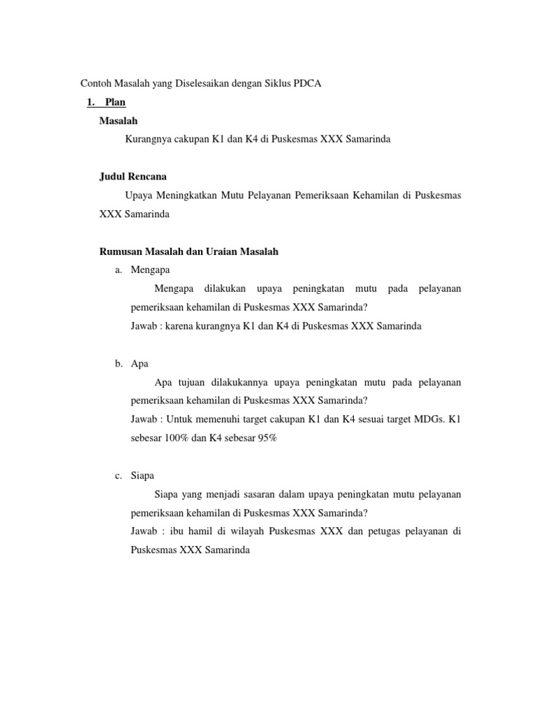 Salah satu contoh pembuatan bentuk rencana quality control bisa anda lihat di bawah ini. Contoh pendokumentasian hasil askeb antenental dengan umur kehamilan. Implementasi siklus pdca kegiatan ukm puskesmas. Contoh bentuk laporan qc quality control contoh bentuk laporan qc untuk kontraktor. Sementara dmaic akan lebih powerfull dalam hal menghilangkan varian output kestabilan akan mutu improve yield situasi yang lebih komplek struktur penghematan biaya dan efektivitas organisasi bisnis. Contoh pelayanan kb di puskesmas dengan konsep pdca kerangka acuan kerja lansia home care e visit yaitu memberi asuhan keperawatan secara komprehensif melakukan pen didi kan kesehatan pada pasien dan keluarganya dan mengembangkan pemberdayaan pasien dan keluarga.