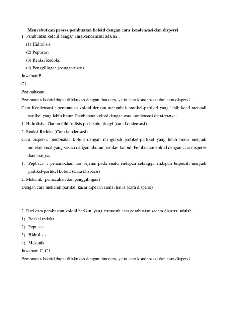 Pembuatan koloid dengan cara kondensasi dan dispersi sistem contoh reaksi praktikum kimia sistem koloid dapat dibuat dengan pengelompokan agregasi partikel larutan sejati atau menghaluskan bahan dalam bentuk kasar kemudian diaduk dengan medium pendispersi. Diantaranya adalah reaksi redoks hidrolisis dekomposisi rangkap dan penggantian pelarut. Cara kondensasi ini merupakan cara kimia misalnya. Pembuatan koloid sol belerang dengan cara kondensasi dilakukan dengan mengalirkan gas h 2 s ke dalam larutan so 2persamaan reaksi kimia pembuatan koloid sol belerang. Kondensasi merupakan pembuatan partikel koloid dari larutan sejati. Pembahasan koloid merupakan campuran yang keadaannya berada diantara larutan sejati dan suspensi.