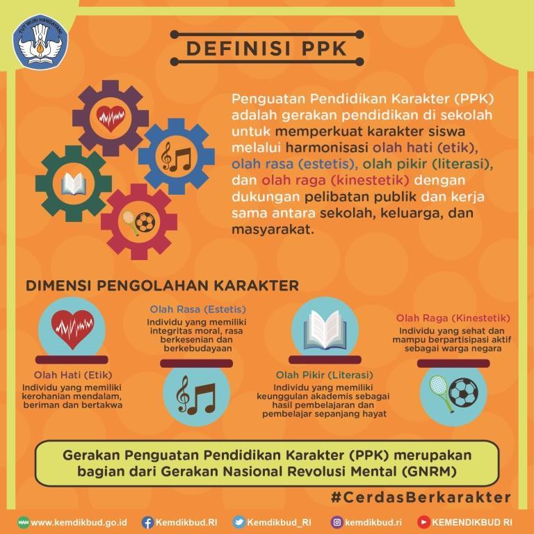 Melalui kebijakan pembelajaran 5 hari. Penguatan pendidikan karakter adalah milik kita semua gerakan pendidikan di sekolah merupakan upaya memperkuat karakter peserta didik dengan mengembalikan marwah pendidikan berasas ki hadjar dewantara yakni olah hati olah rasa olah karsa dan olah raga.