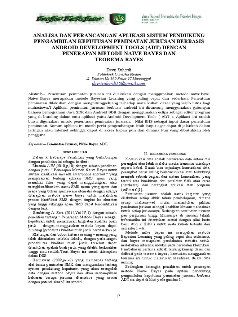 Contoh penerapan metode naive bayes. Anda bisa membaca lebih dalam tentang metode naive bayes di artikel algoritma naive bayes classification pada pembahasan kali ini saya akan memberikan contoh perhitungan metode naive bayes untuk sistem pakar penentuan kerusakan pada laptop pada tahap awal kita harus mempunyai data kerusakan dan gejala laptop terlebih dahulu. Bayes mencari fakta keberadaan tuhan didunia kemudian mengubahnya dengan nilai probabilitas. Penerapan metode naive bayes naive bayes didasarkan pada asumsi penyederhanaan bahwa nilai atribut secara kondisional saling bebas jika diberikan nilai outpu t. Algoritma naive bayes merupakan sebuah metoda klasifikasi menggunakan metode probabilitas dan statistik yg dikemukakan oleh ilmuwan inggris thomas bayesalgoritma naive bayes memprediksi peluang di masa depan berdasarkan pengalaman di masa sebelumnya sehingga dikenal sebagai teorema bayesciri utama dr naïve bayes classifier ini adalah asumsi yg sangat kuat naïf akan independensi dari. Naïve bayes merupakan metode klasifikasi yang berdasarkan pada teorama bayes. Jurnal skripsi metode naive bayes.