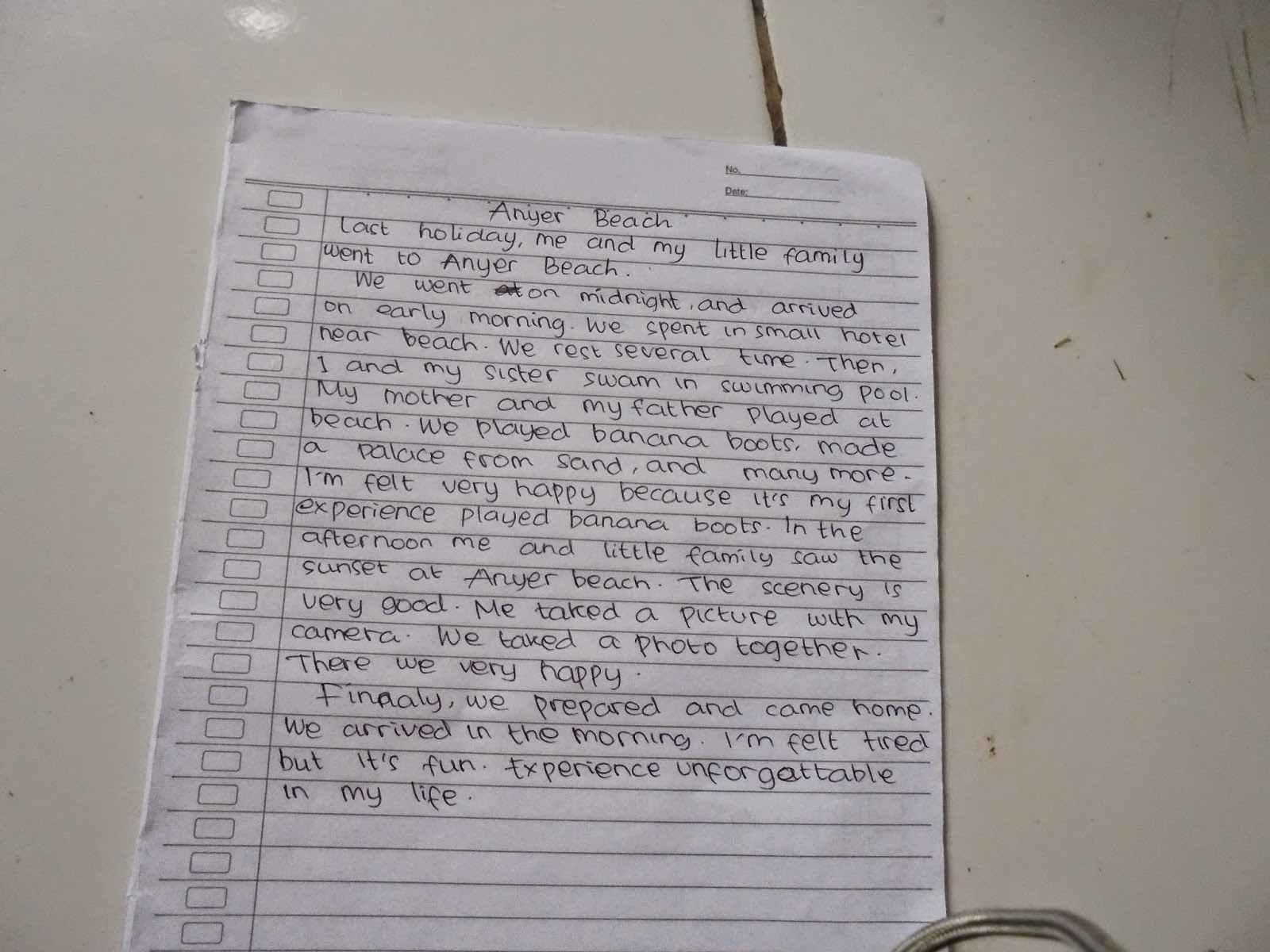 Contoh pengalaman liburan dalam bahasa inggris menggunakan past tense. Aku bangung pagi pagi lalu pergi ke pasar untuk membeli beberapa ekor udang yang akan aku gunakan sebagai umpan. After that we play games in game zone. Ada juga rangkuman sehingga kamu lebih paham isi paragraf bahasa inggris. Kamu bisa menggunakan simple past tense past continuous tense past perfect dan past perfect continuous dalam bentuk kalimat lainnya yang mengambil latar waktu yang berbeda. Contoh cerita liburan dalam bahasa inggris artinya cerita liburan merupakan cerita yang biasanya ditulis oleh para siswa saat masuk sekolah setelah liburan panjang. Contoh paragraf simple past tense tentang liburan tentang diri sendiri daily activity holiday tentang pengalaman paragraph tentang pengalaman.