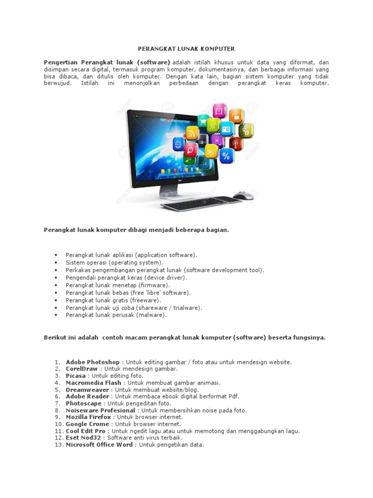 Contoh perangkat lunak komputer. Perangkat lunak yang memiliki fungsi sebagai pengolah gambar atau desain membuat gambar atau pola editting dll contoh. Secara garis besar perangkat lunak komputer juga masih dapat digolongkan menjadi 2 bagian yaitu. Fungsinya bisa kita katakan sebagai dasar dan penghubung antara perangkat keras komputer dan perangkat lunak yang akan menjalankan fungsinya. Adware yaitu software yang bisa didapatkan dan digunakan secara gratis namun dengan kompensasi adanya iklan yang muncul di komputer user. Sehingga anda bisa mendengar suara audio di speaker anda. Freeware yaitu perangkat lunak yang dapat dimiliki dan digunakan secara gratis tanpa batas waktu tertentu.
