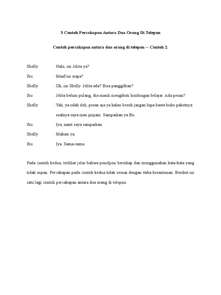 Itu pasti sudah sering kita lakukan bukan. Berbeda dengan contoh di atas yang hanya melibatkan 2 orang percakapan di bawah ini terdiri dari 3 orang yang berperan di dalamnya. Speaking dengan percakapan bahasa inggris 2 orang singkat dan artinya di telepon. Kumpulan contoh percakapan bahasa indonesia singkat berikut ini mungkin bisa jadi referensi untuk kalian yang mendapat tugas untuk membuat percakapan bahasa indonesia antara dua orang. Sebelum melakukan percakapan dua orang di telepon terlebih dahulu anda harus memahami etika bertelepon yang baik. Contoh percakapan melalui telepon yang baik dan benar oleh berpendidikan diposting pada 2 juni 2019.