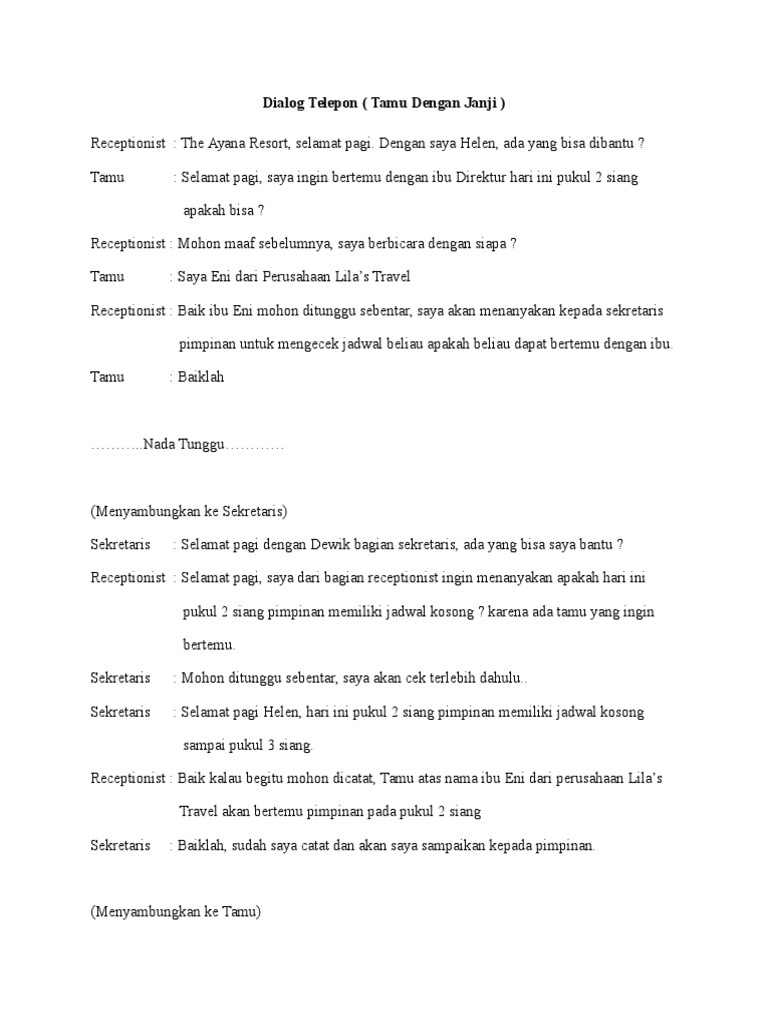 Contoh percakapan telepon resmi. Untuk anda yang sedang mencari dan membutuhkan percakapan sekretaris dalam telepon berikut ini saya berikan dalam bahasa indonesia dan bahasa inggris. Bahkan untuk mengurangi rasa grogi atau kurang pede sahabat dapat melakukan percakapannya dengan menggunakan bantuan telepon atau hp. Contoh percakapan sekretaris melalui telepon. Computer of informatics team. Kuliah bahasa inggris contoh percakapan telepon dalam bahasa inggris antara 2 orang berlatih berkomunikasi menggunakan bahasa inggris dapat pula sahabat kbi lakukan dengan melakukan percakapan percakapan singkat dalam bahasa inggris. Semoga artikel ini dapat menambah ilmu anda.