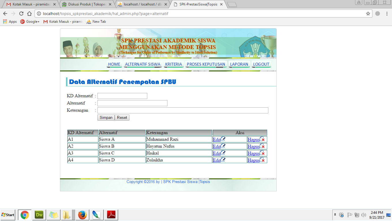 Sebagai contoh dari hasil penelitian telah ditentukan nilai kriteria sebagai berikut. Topsis merupakan suatu bentuk metode pendukung keputusan yang didasarkan pada konsep bahwa alternatif yang terbaik tidak hanya memiliki jarak terpendek dari solusi ideal positif tetapi juga memiliki jarak terpanjang dari solusi ideal negative. Buat sebuah matriks xij yang terdiri atas m alternatif dan n kriteria. Metode topsis ini metode yang cukup panjang diimplementasikan menjadi aplikasi atau program untuk contoh perhitungan manual dan source code dapat dilihat disini contoh aplikasi metode topsis beserta perhitungan manualnya.