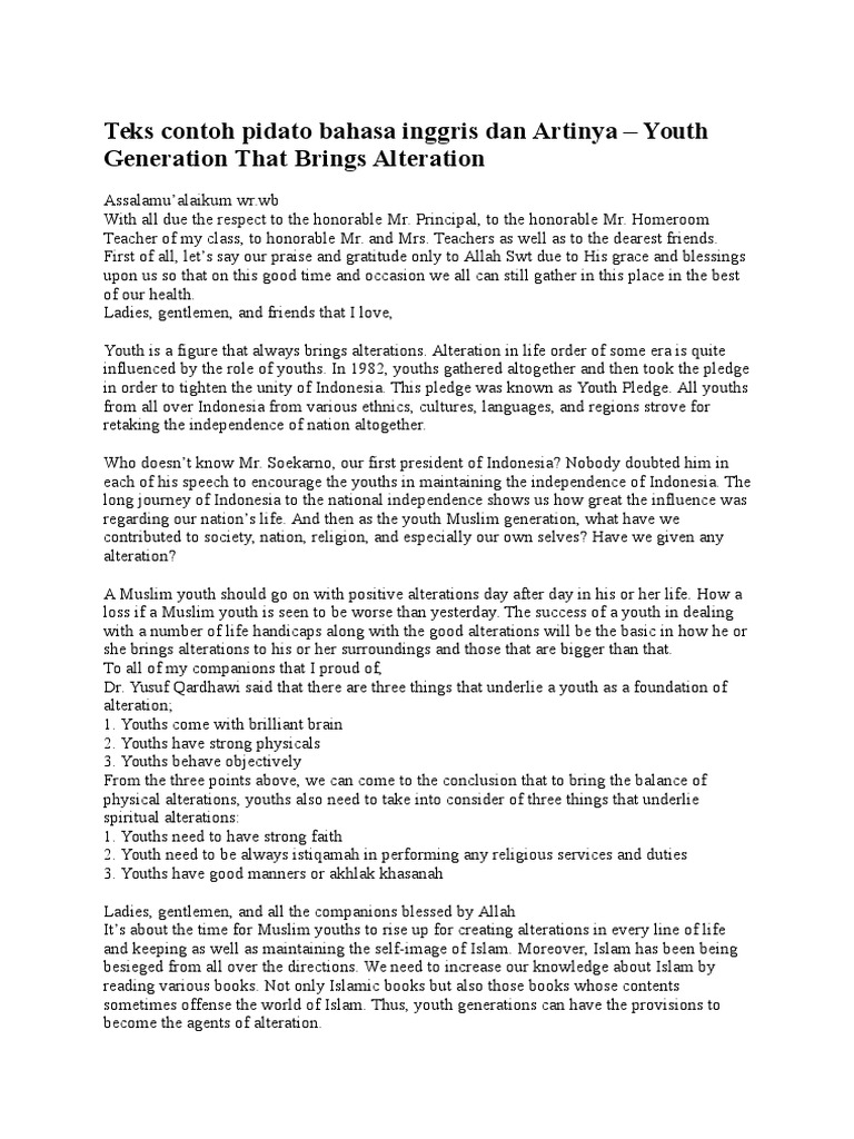 Contoh pidato bahasa inggris singkat dan artinya. Selain bukan bahasa utama kita juga dalam pidato harus melihat target audiencenyaseperti misalnya dalam pidato perpisahan sekolah tidak mungkin kita menggunakan bahasa inggris dalam menyampaikan isi pidato kita. Selain contoh pidato singkat bahasa inggris tersebut contohtext juga memiliki berbagai referensi lainnya dalam belajar bahasa inggris seperti contoh iklan dalam bahasa inggris contoh undangan pernikahan dalam bahasa inggris hingga berbagai materi mengenai grammar tenses dan vocabulary. Nah untuk lebih jelasnya yuk disimak materi pidato bahasa inggris yang singkat tentang pendidikan. Contoh pidato bahasa inggris singkat. Seperti contoh pidato tentang pendidikan yang akan disajikan berikut ini. 12 contoh pidato bahasa inggris beserta artinya menyampaikan pidato berbahasa inggris sebenarnya tidak sulit.