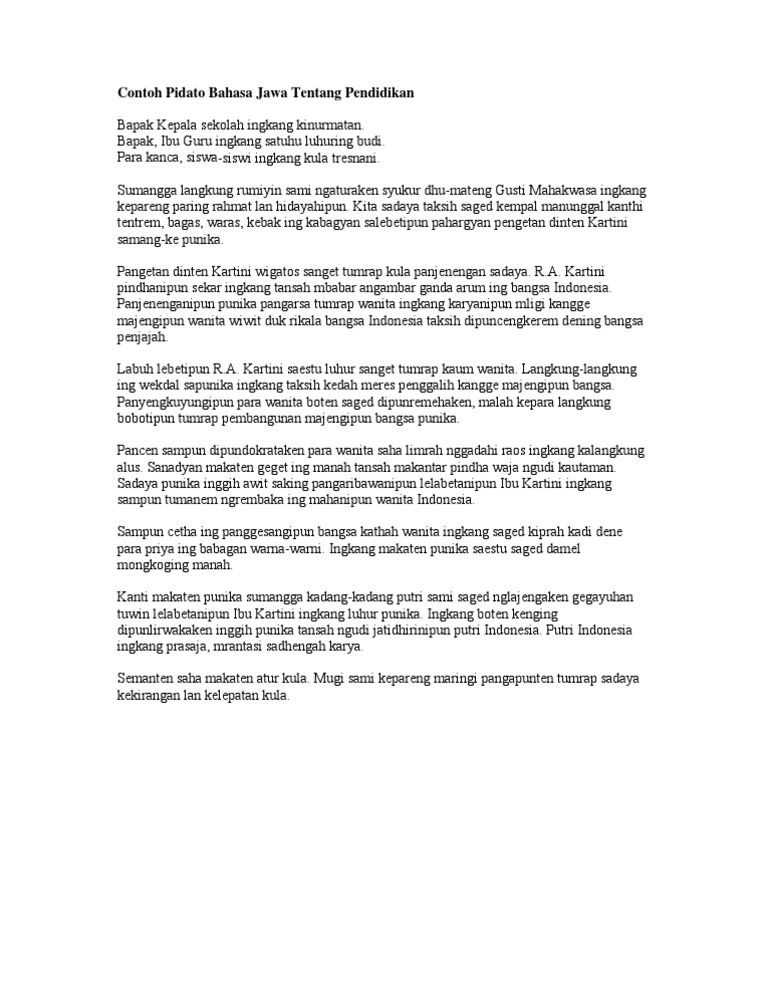 Apalagi jika kita hidup di daerah jawa. Berikut ini terdapat beberapa referensi pidato bahasa jawa dalam berbagai tema. Langkung rumiyin monggolah kita sesarengan ngunjukaken takwa. Karena narkoba akan merubah hidup kita ke arah yang lebih buruk jika kita tidak membentengi diri dari sekarang. Ingkang kinurmatan bapak ibu guru smpn 1 japah sedaya kanca kanca seperjuangan ingkang kawula tresnani. Cotoh pidato bahasa jawa diatas merupakan contoh yang sifatnya general.