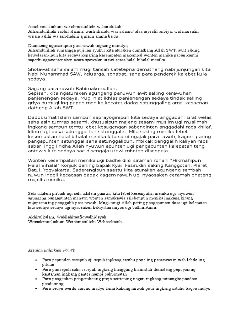 Pidato bahasa jawa halal bihalal. Contoh proposal halal bi halal lengkap februari 04 2017. Contoh teks pidato sambutan ketua panitia halal bihalal bapak bapak dan ibu ibu yang kami hormati hadirin dan hadirat yang berbahagia assalamualaikum warahmatullahi wabarakatuh. Bismillah hirrahmanirrakhim alhamdulillah hi rabbilalamin wassalatu wassalamuala sayyidina muhammadin khairil anaam wa ala aalihi wa sahbihil kariim. Contoh teks pidato sambutan ketua panitia halal bihalal bapak bapak dan ibu ibu yang kami hormati hadirin dan hadirat yang berbahagia assalamualaikum warahmatullahi wabarakatuh. P r o p o s a l.