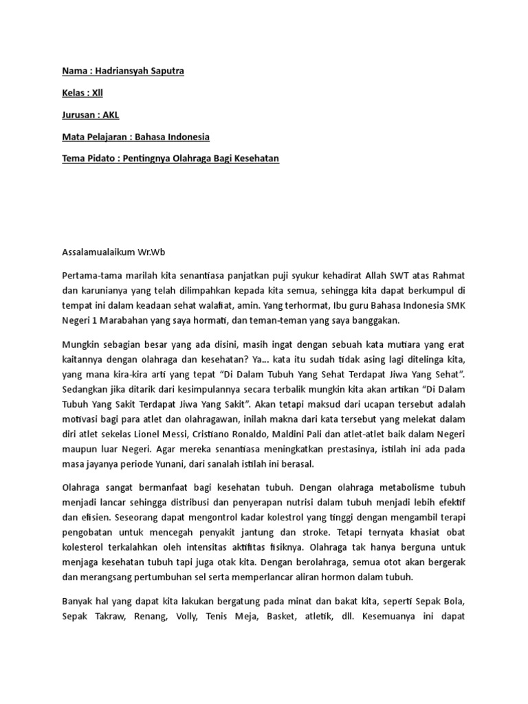 Contoh pidato persuasif semua pidato memiliki tujuan sama yaitu agar dapat menyampaikan sesuatu yang berkaitan dengan momen tertentu misalnya pidato pelantikan maka isinya tentang orang orang yang dilantik dan hal lain yang berkaitan dengan pelantikan. Demikianlah pembahasan mengenai 25 contoh pidato persuasif perpisahan lingkungan kebersihan disiplin islami kesehatan dan pendidikan semoga dengan adanya ulasan tersebut dapat menambah wawasan dan pengetahuan anda semua terima kasih banyak atas kunjungannya. Teks pidato dengan judul pola hidup sehat ini bisa menjadi referensi juga para siswa untuk melatih diri membaca pidato di depan kelas. Contoh pidato kesehatan pola hidup sehat assalamualaikum wr. Pidato tentang kesehatan alangkah baiknya pidato yang berbentuk kata kata saja dapat disampaikan lebih baik dengan memperhatikan ekspresi wajah intonasi suara dan juga tingkah laku.