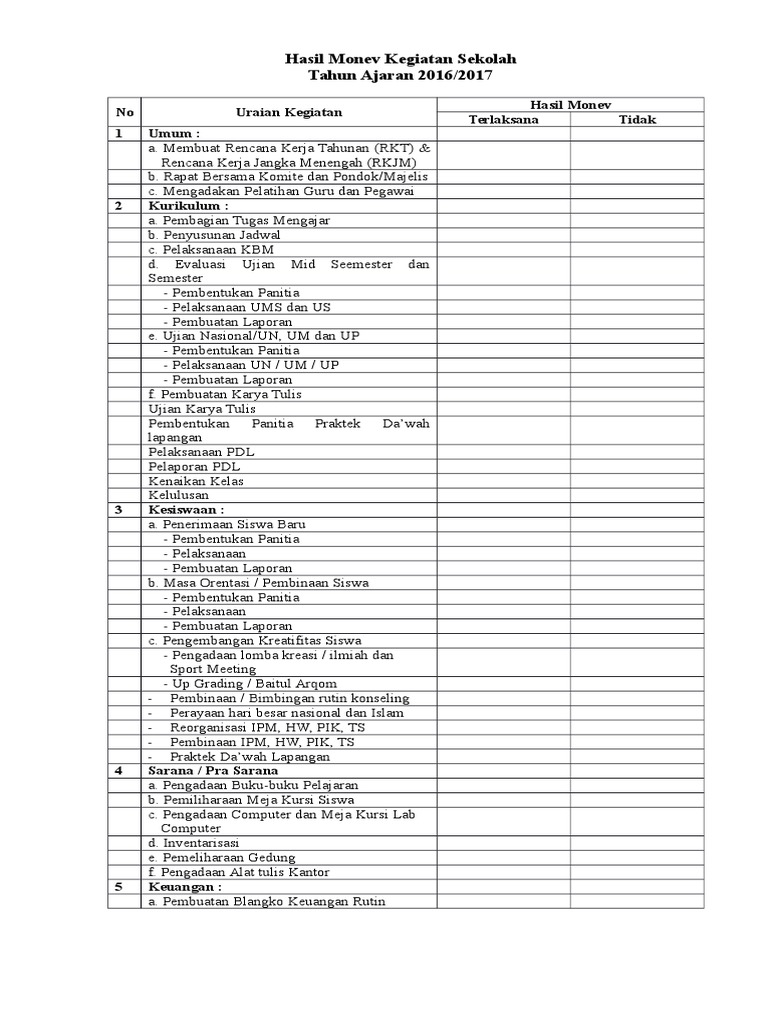 Program monitoring dan evaluasi kegiatan di sekolah contoh nama sekolah. Rincian program supervisi monitoring dan evaluasi sma negeri 1 batu selama empat tahun adalah sebagai berikut. Monev penyelenggaraan pendidikan di sekolah 1. Sedangkan monitoring dan evaluasi eksternal dapat dilakukan oleh pihak luar sekolah misalnya pengawas dinas pendidikan yang hasilnya dapat digunakan untuk rewards system terhadap individu sekolah dalam rangka meningkatkan iklim kompetisi sehat antar sekolah kepentingan akuntabilitas publik bagi perbaikan sistem yang ada keseluruhan dan membantu sekolah dalam mengembangkan dirinya. Eksternal c komite sekolah. Dengan program monev ini berarti untuk melihat sejauh mana target sekolah sudah tercapai apa belum selama ii semester ini.