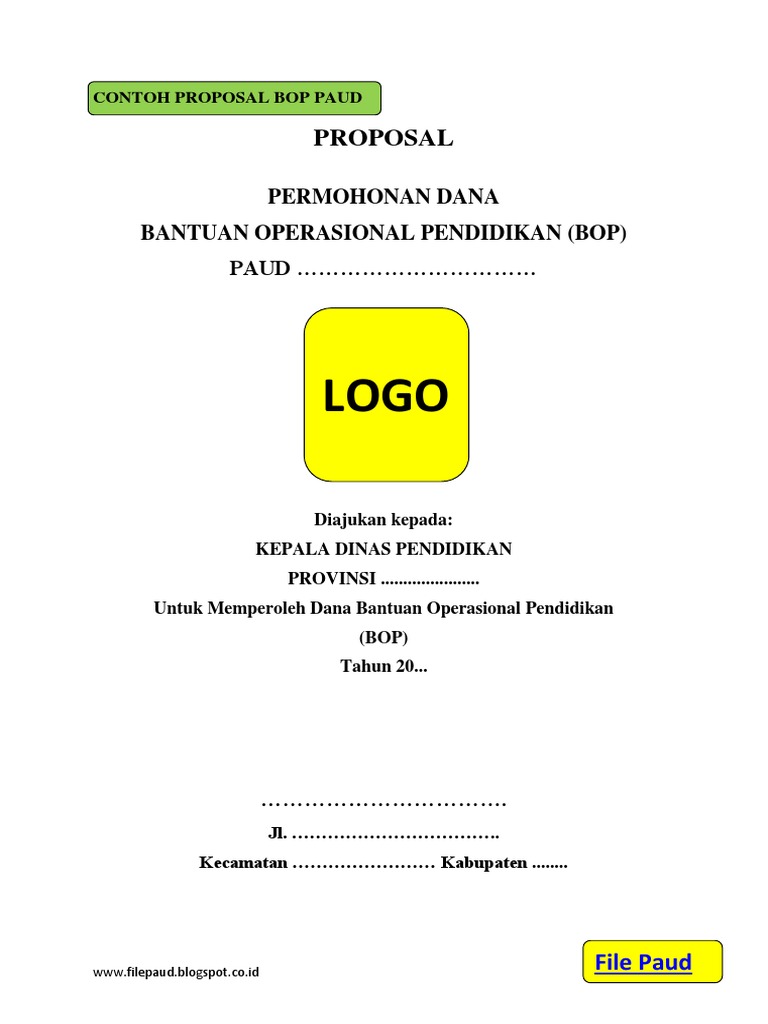 Contoh proposal bop paud 2018 pengajuan bantuan operasional paud ini merupakan file terbaru yang akan saya bagikan dalam postingan saya kali ini khsuusnya untuk lembaga pendidikan anak usia dini paud baik jenis jenjang tk maupun kober yang belum menerima dana operasional dari pemerintah. Contoh proposal bop paud 2017 new update 20172018 dokumen guru sekolah ini ditujukan bagi siapa saja yang membutuhkan untuk digunakan sebagai referensi sesuai keperluan baik itu di lingkungan sekolah pendidikan dan kesehatan ataupun umum untuk guru bahkan operator sekolah. Adapun contoh proposal bop paud tahun 2017 format word tersebut bisa anda download pada url link download namun sebelumnya anda bisa melihatnya terlebih dahulu pada bagian preview berikut di bawah ini. Proposal ini bisa menjadi langkah awal untuk lembaga paud anda dalam mengajukan bop. Download contoh brosur penerimaan siswa baru tk format cdr. Proposal bop paud 2017 terbaru yang admin bagikan ini merupakan salah satu file yang sangat penting yang dapat anda gunakan sebagai bahan contoh dalam pembuatan bantuan operasional pendidikan.