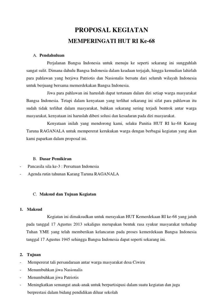 Di bulan tersebut biasanya diperingati dengan banyak sekali kegiatan seperti lomba lomba dari tingkat rt rw hingga kecamatan dan kabupaten. Contoh proposal kegiatan sekolah 17 agustus. Berikut adalah contoh proposal 17 agustus yang saya buat sebagai percontohan adalah smu ypk 1 tenggarong tempat saya menimba ilmu. Program kegiatan harus memiliki tema dan keterangan yang jelas tentang bagaimana perencanaan dan pelaksanaan yang diharapkan. Itulah contoh proposal 17 agustus di sekolah yang bisa kamu copy paste dan edit di mirosoft word lalu cetak pdf sesuai dengan kebutuhan kamu di sekolah.