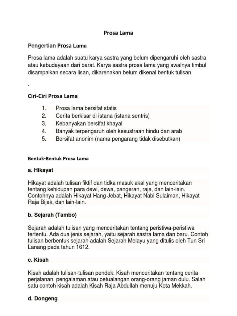 Beberapa yang termasuk dalam prosa lama adalah. Prosa adalah jenis tulisan yang dibedakan dengan puisi sebab variasi ritme yang dipunya lebih besar dan bahasanya yang sesuai dengan arti leksikalnya.