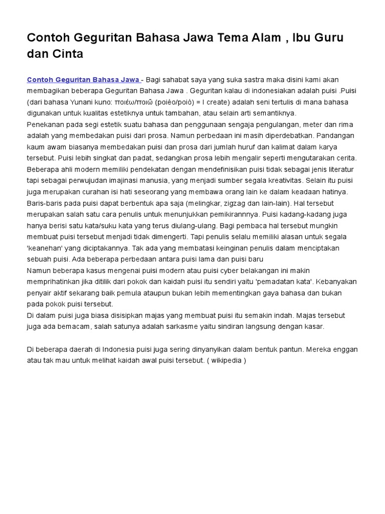 Puisi apa yang sering anda buat. Geguritan berkembang dari tembang jawa yaitu liriksajak yang mempunyai irama nada dalam bahasa indonesia disebut lagu. Contoh geguritan bahasa jawa apakah anda suka dalam menulis puisi. Puisi jawa yang berkembang pada saat ini yang lebih bersifat bebas dan memiliki tipografi yang bebas. Hal tersebut dikarenakan berkembangnya bahasa dari masa ke masa yang menyebabkan pergeseran penggunaan istilah geguritan. Banyak sekali orang yang menyukai segala sesuatu yang berhubungan dengan puisi baik membuat puisi ataupun membaca puisi.