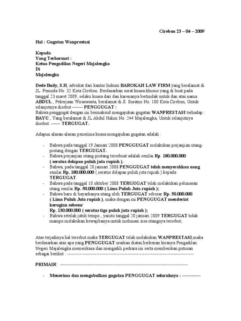 Berdasarkan peraturan mahkamah agung republik indonesia nomor 2 tahun 2015 tentang tata cara penyelesaian gugatan sederhana yang telah dirubah dengan peraturan mahkamah agung republik indonesia nomor 4 tahun 2019 yang dimaksud dengan penyelesaian gugatan sederhana adalah tata cara pemeriksaan di persidangan terhadap gugatan perdata dengan nilai gugatan materil paling banyak rp. Untuk setiap harinya kepada penggugat apabila ternyata tergugat lalai memenuhi isi putusan hukum yang berkekuatan hukum tetap. Surat gugatan sederhana contoh tanjung karang 07 september 2007. Bahwa penggugat dalam hal ini mengajukan gugatan wanprestasi terhadap nama lengkap tergugat. Gugatan sederhana merupakan gugatan perdata dengan nilai gugatan materiil paling banyak rp200000000 dua ratus juta rupiah yang diselesaikan dengan tata cara dan pembuktian yang sederhana. Upaya hukum terhadap putusan gugatan sederhana dapat dilakukan dengan mengajukan keberatan.