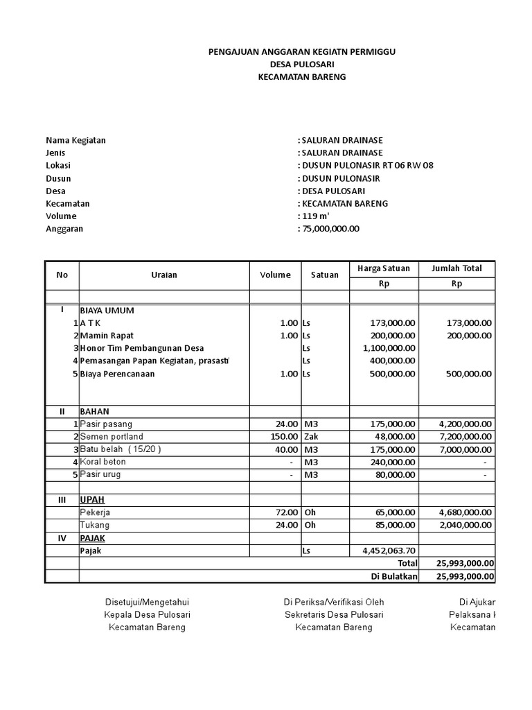 Panitia pembangunan drainase jalan desa yang susunannya sebagai dasar dalam penetapan surat keputusan petinggi tritis. Sebagai contoh diketahui dimensi atau ukuran drainase dengan bentuk penampang trapesium lebar atasnya adalah 15 m lebar bawah 1 m dan ketinggian saluran drainase termasuk freeboard adalah 1 m. Rab dreinase abdi rusdyanto academiaedu. Untuk menjaga kualitas jalan agar tetap dalam kondisi baik karena adanya drainase maka permukaan jalan akan tetap kering dan terhindar dari kerusakanpada lapisan aspal maupun lpa. 321070000 tiga ratus dua puluh satu juta tujuh puluh ribu rupiah termasuk ppn. Proposal pembangunan saluran air pada kanan kiri jalan di rt.