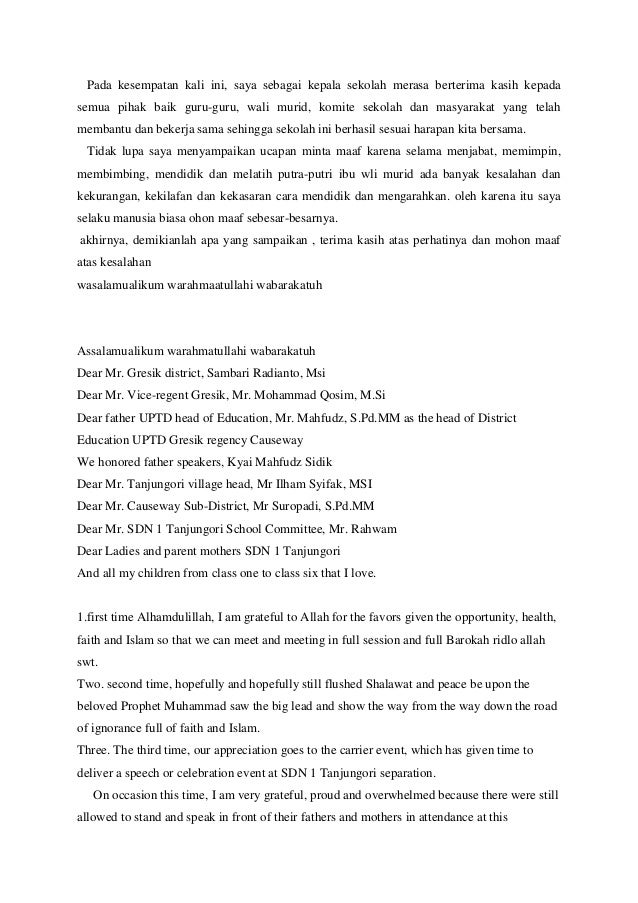 Semoga amalan yang telah ibu berikan dibalas oleh allah swt. Setelah sebelumnya kami memberikan contoh pidato perpisahan siswa sd kali ini kami juga ingin memberikan contoh sambutan wali murid perpisahan tk 2017. Kami ingin tetap menjalin hubungan yang baik terhadap seluruh warga di desa ini. Saya memohon maaf seandainya ada yang jauh lebih pantas untuk menyampaikan sambutan ini semoga semua hasrat hati yang ingin disampaikan bisa terwakili. Contoh pidato sambutan perpisahan wali murid pertama tama marilah kita bersyukur kepada allah yang maha kuasa karena berkat rahmat dan karunia nya jualah kita dapat berkumpul bersama untuk menghadiri acara perpisahan putra putri kita pada hari ini. Contoh pidato perpisahan kelas 6 assalamu alaikum warahmatullahi wabarakatuh bapak kepala sekolah para guru dan para orang tua murid yang kami hormati dan teman temanku serta adik adik kelas yang tercinta.