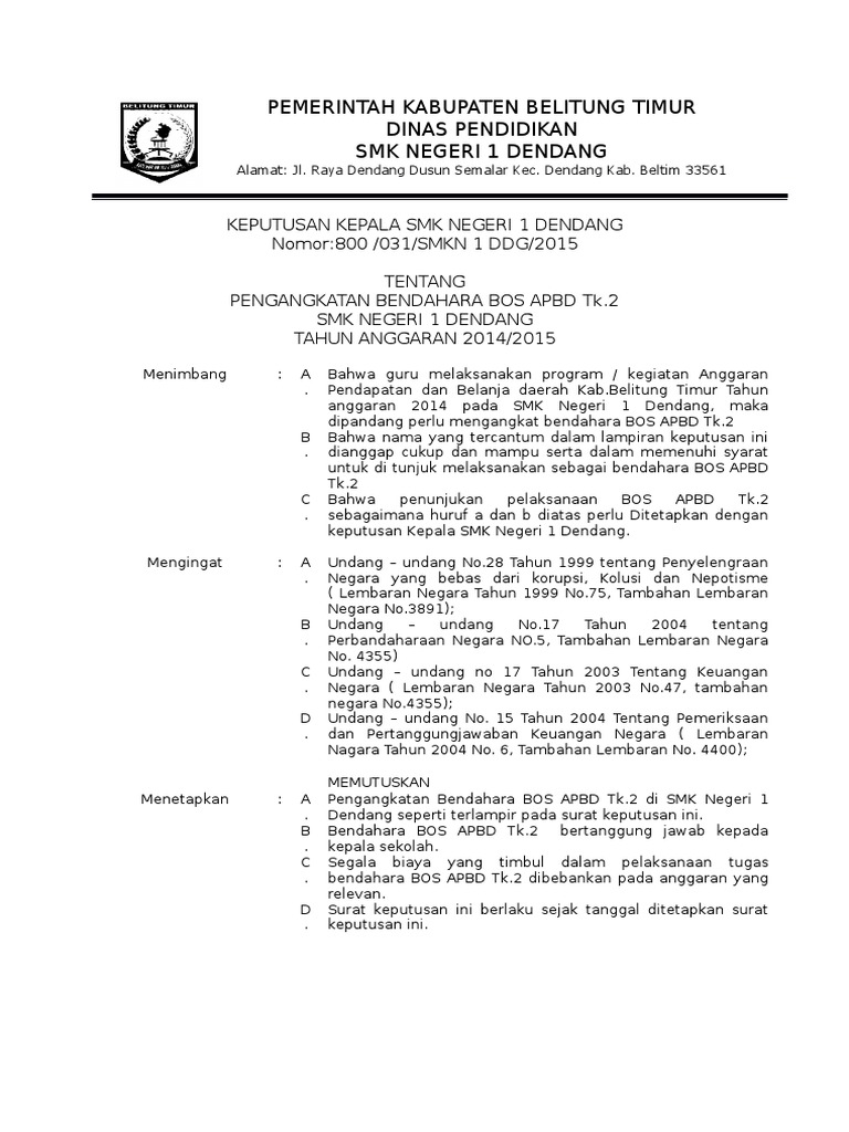 Semoga contoh sk bendahara bos ini dapat bermanfaat bagi yang membutuhkan dan dapat digunakan sebagai mestinya. Kumpulan contoh surat keputusan sk kepala sekolah lengkap administrasi sekolah sk kepala sekolah surat keputusan atau yang biasa lebih dikenal dengan sk merupakan sebuah surat pernyataan yang dikeluarkan oleh lembaga tertentu formal maupun non formal yang berisi suatu kebijakan atau keputusan tertentu yang berhubungan dengan lembaga tersebut. Bahwa saat ini sudah diatur juga dalam juknis bos untuk honor seorang bendahara bos yang jumlahnya sekitar rp250000 ini merupakan honorarium untuk bendahara bos di daerah kami. Contoh sk bendahara sekolah. Contoh sk bendahara sekolah yayasan yang bisa bapakibu gunakan dan diunduh secara gratis dengan menekan tombol download biru dibawah ini. Contoh sk tata usaha.