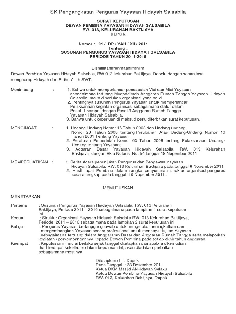 Contoh sk pengangkatan ketua yayasan. 01 dp yah xii 2011. Contoh surat keputusan pengangkatan kepala sekolah merupakan surat keputusan yang dikeluarkan oleh ketua yayasan tentang pengangkatan kepala sekolah yang barujika anda ingin melihat bagaimana contohnya berikut ini kami sertakan di bawah ini. 034ydskviii2013 tanggal 20 agustus 2013 tentang pengangkatan rektor institut teknologi del. Sk pengangkatan pengurus yayasan hidayah salsabila surat keputusan. Kabupaten cilacap 53255 jawa tengah. Pondok pesantren miftahul huda.