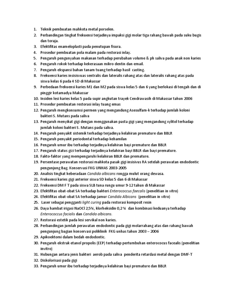 Jika temen temen mahasiswa kedokteran saat ini masih dalam masa penentuan judul skripsi atau proposal skripsi maka daftar contoh judul skripsi kedokteran umum terbaru mudah dikerjakan di bawah ini pasti sangat bermanfaat sebagai bahan pertimbangan atau bahkan sumber ide judul skripsi. Kumpulan judul contoh skripsi kedokteran soft copy kode o23 pdf daya antibakteri ekstrak daun teh camellia sinensis terhadap pertumbuhan streptococcus sp. Artikel makalah proposal kebidanan kedokteran keperawatan contoh. Bahwa dalam rangka untuk menunjang kelancaran pelaksanaan pendidikan dalam penulisan skripsi di fakultas kedokteran gigi universitas airlangga dipandang perlu untuk menetapkan penyusun pedoman penulisan skripsi. Judul contoh skripsi kedokteran gigi soft copy kode o41 pdf distribusi dan frekuensi pasien ameloblastoma berdasarkan tipe histopatologis dan jenis kelamin di poli bedah mulut rumah sakit umum ciptomangunkusumo periode januari 2002 juli 2008 08. 11 latar belakang angka kematian maternal dan neonatal di indonesia masih tinggi yaitu 307100000 kelahiran hidup dan 520100000 kelahiran hidup.