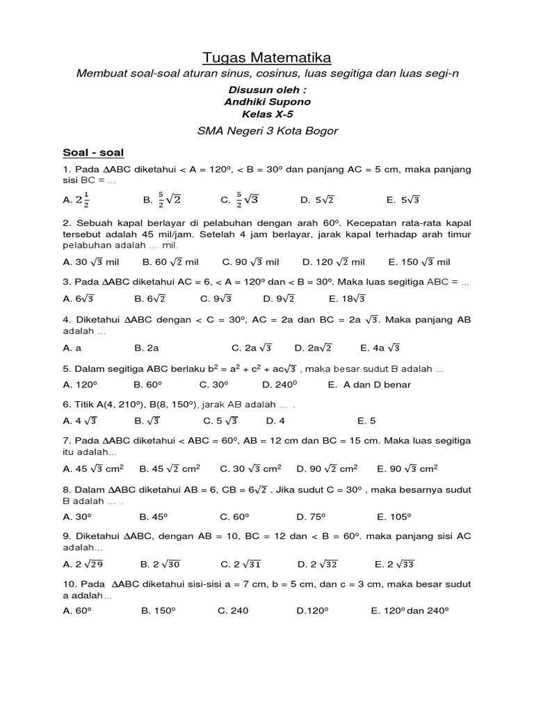 Contoh soal aturan sinus cosinus dan luas segitiga. Pada segitiga siku siku cukup dengan 1 sisi dan 1 sudut tidak termasuk sudut siku siku ataupun 2 sisi diketahui kita telah dapat menentukan sisi dan sudut lainnya yaitu dengan menggunakan. Pada postingan ini kita membahas contoh soal aturan sinus aturan cosinus dan penyelesaiannya pembahasannya. April 28 2017 bimbingan belajar ilmu pengetahuan inspirasi. Beberapa materi yang perlu dikuasai agar dapat menyelesaikan soal aturan sinus dan aturan cosinus adalah perbandingan trigonometri khususnya fungsi sinus dan cosinus sudut istimewa trigonometri rumus luas segitiga sembarang dengan memanfaatkan sudut sinus persamaan pada aturan sinus dan persamaan aturan cosinus. Soal dan pembahasan bangun datar gabungan. Luas segitiga ½ 35.