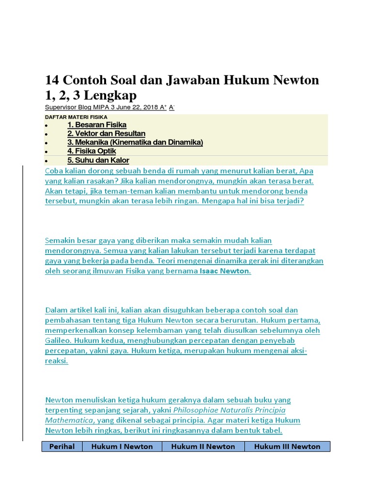 Hukum newton hukum newton murupakan suatu hukum yang ada dalam dunia fisika yang menggambarkan hubungan antara suatu gaya yang bergerak dikarenakan adanya sebab. Sesuai dengan namanya hukum newton dikemukaan oleh seorang ahli fisika matematika dan filsafat dari inggris yang bernama sir isaac newton 1643 1722. Gaya aksi dan reaksi dari dua benda memiliki besar yang sama dengan arah terbalik dan segaris. Selamat membaca dan belajar semoga bisa paham. Pada kasus yang kedua ini benda bergerak dengan percepatan 2a massa benda ditambah dan ditarik dengan gaya fpada kasus yang ketiga benda bergerak dengan percepatana2. Hukum newton 1 2 3 pengertian bunyi rumus contoh by azzahra rahmah posted on december 2 2019 rumuscoid kembali lagi bersama kami rumuscoid pembahasan kali ini sangat menarik dari bidang fisika yaitu hukum newton.