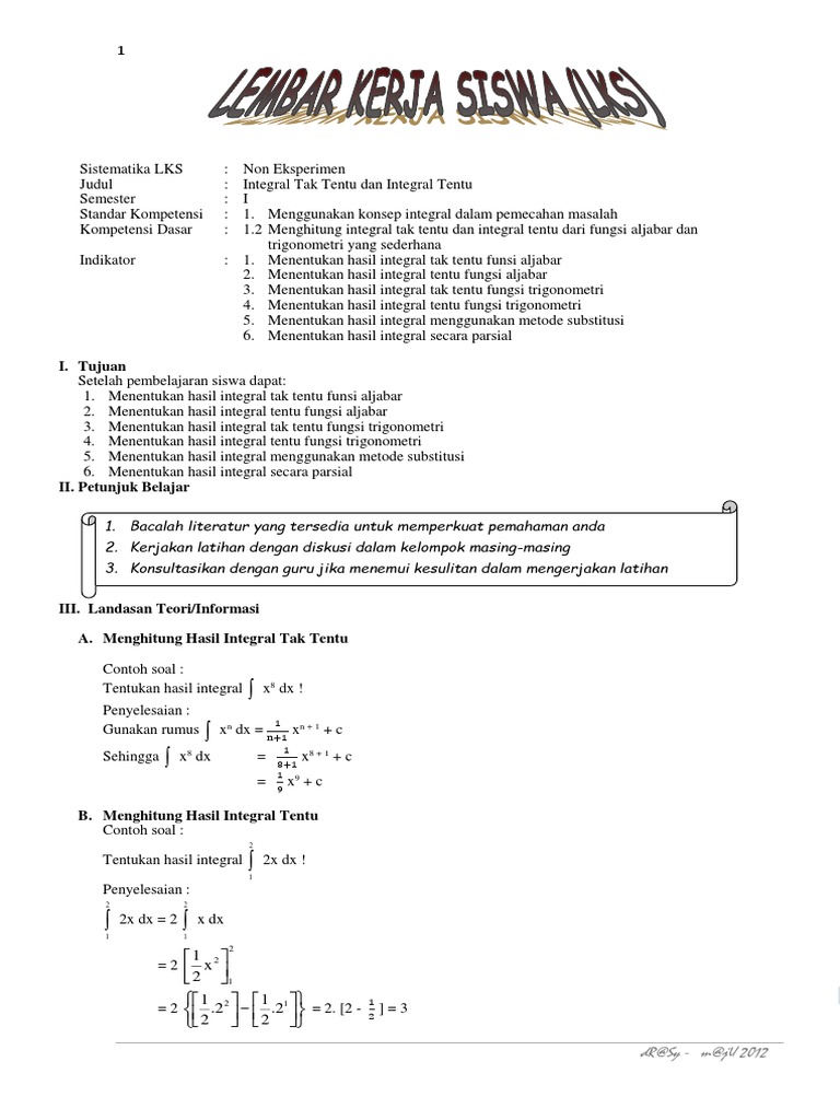 Contoh soal integral tak tentu dan penyelesaiannya. Mata pelajaran matematika kali ini akan membahas tentang integral dimana fokus kita tentang integral tak tentu. Integral merupakan cabang ilmu matematika yang memiliki tingkat kesulitan cukup tinggi. Contoh soal integral tak tentu pada postingan ini kita membahas contoh soal integral tak tentu dan penyelesaiannya. Integral tak tentu tidak memiliki batas atas dan batas bawah sedangkan integral tentu mempunyai batas atas dan. Yah kita akan belajar bersama mulai dari apa yang dimaksud dengan integral tak tentu bagaimana rumusnya serta bagaimana cara menyelesaikan permasalahan yang ada. Penjelasan tentang contoh soal integral tentu tak tentu substitusi parsial trigonometri beserta pengertian dan jenis jenis integral dan pembahasannya integral trigonometri menentukan persamaan kurva gradien dan persamaan garis singgung kurva di suatu titik.
