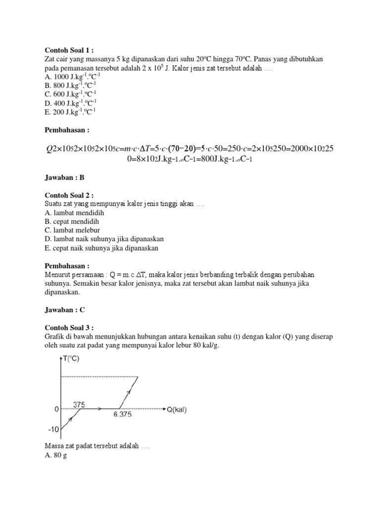 Dari benda bersuhu tinggi menuju suhu yang lebih rendah karena bersinggungan. Kalor yang dibutuhkan untuk proses dari titik adalah. Perhatikanlah gambar yang ada dibawah ini dan hitunglah jumlah kalor yang diperlukan untuk merubah 500 gram es yang ada pada titik a ke c apabila kalor jenis es 2100jkg ºc dan kalor lebur es itu adalah 336000 jkg. Contoh file download soal uts untuk kelas 654321 sd semester 1 berikut ini adalah kumpulan dari berbagi sumber tentang soal kalor dan perpindahannya kelas 7 k13 yang bisa gunakan untuk administrasigoogle drivesoal uts sd dan diunduh secara gratis dengan menekan tombol download biru dibawah ini. Guru sd smp sma soal kalor dan perpindahannya kelas 7 k13. Sekian pembahasan mengenai materi kalor yang memuat pembahasan mengenai rumus kalor contoh soal kalor dan pembahasannya serta contoh soal grafik perubahan wujud zat.