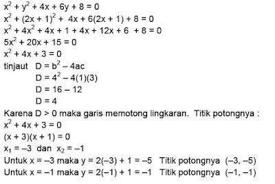 Karena nilai 0 maka garis tersebut tidak memotong lingkaran saling lepas. Kedudukan suatu titik terhadap lingkaran dapat dibedakan berdasarkan persamaan lingkaran.
