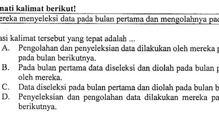 Contoh soal memvariasikan kalimat. Disajikan sebuah kutipan kalimat siswa mampu memvariasikan kalimat tersebut dengan kalimat lain. Contoh soal memvariasikan kalimat dan pembahasan. Variasi kata melihat pada kutipan kalimat berikut yang kurang tepat adalah. Pembahasan soal un 20172018 bahasa indonesia sma nomor 45 materi memvariasikan kalimat. Sardjito lahir di magetan jawa timur 13 agustus 1889. Disajikan kutipan kalimat siswa dapat memvariasikan kata yang digunakan dengan pilihan kata lain yang tepat.