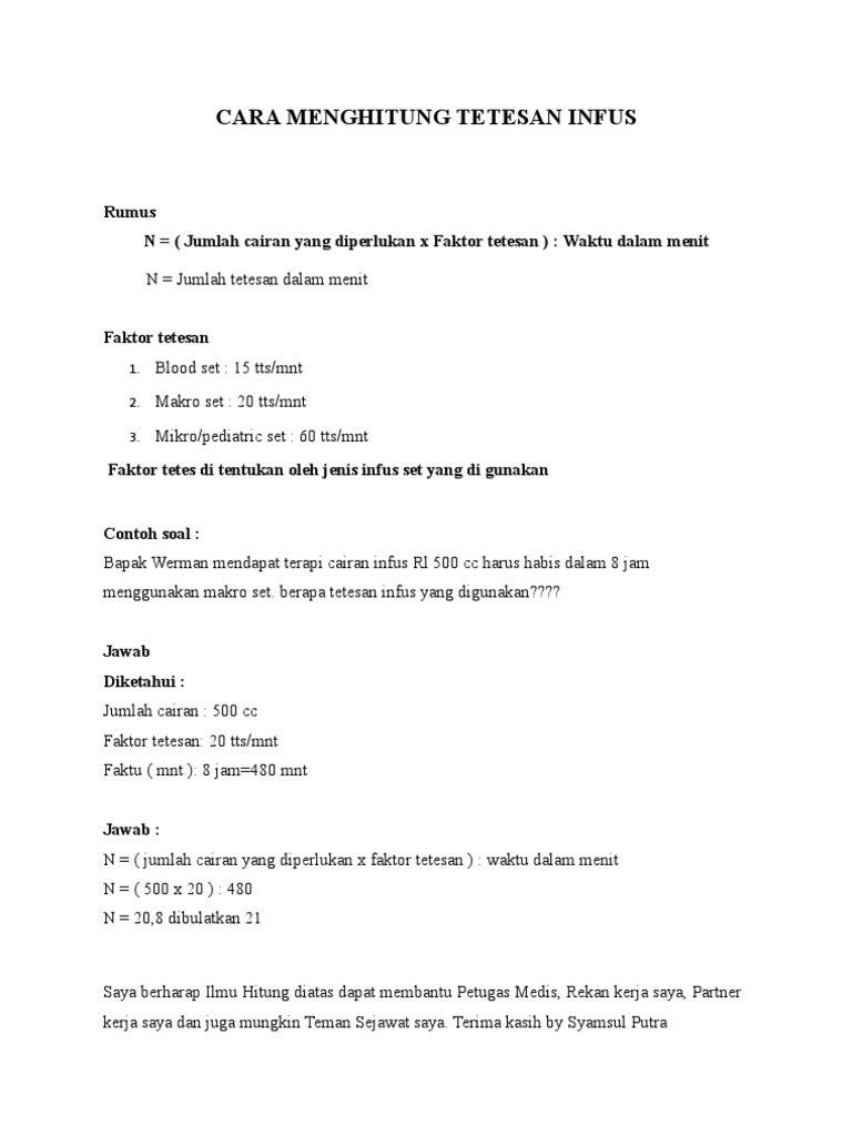 Contoh soal menghitung tetesan infus. Kamu tidak perlu khawatir ketika nanti hendak menerapkan rumus ini. Semoga materi sederhana ini mudah dimengerti. Rumus tetesan infus setiap ahli medis harus tahu bagaimana cara menghitung tetesan infus dengan tepat dan benar. Untuk mengerti dan memahami bagaimana cara menghitung tetesan infus coba simak contoh cara menghitung tetesan infus dalam bentuk kasus berikut ini. Cara menghitung cairan infus kali ini kita akan membahas tentang cara menghitung dan berbagai ilmu yang dibutuhkan dalam kehidupan sehari hari. Tadi kita sudah membahas contoh soal menghitung tetesan infus cara menghitung tetesan infus 20 tpm dan cara menghitung tetesan infus pump.