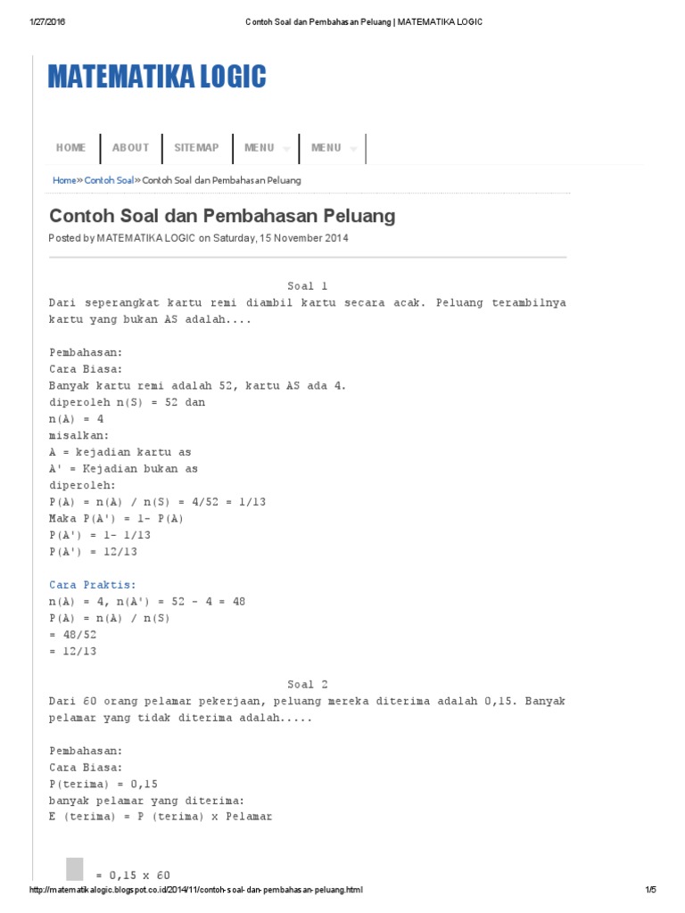 Berikut ini adalah contoh soal peluang. Oh ya kalau kalian tidak keberatan informasikan kepada teman teman kalian kalau ada blog namanya. Semoga bisa menambah referensi untuk belajar. Sampai bertemu pada artikel selanjutnya. Contoh soal peluang pilihan ganda dan jawaban pembahasan untuk siswa smpmts peluang atau kebolehjadian atau disebut juga sebagai probabilitas merupakan cara untuk mengungkapkan pengetahuan atau kepercayaan bahwa suatu kejadian akan berlaku atau telah terjadi. Konsep ini telah dirumuskan dengan lebih ketat dalam matematika dan kemudian digunakan secara lebih luas dalam tidak hanya.