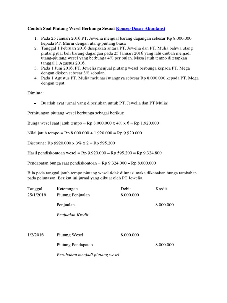 Setelah memahami tentang perbedaan piutang sebagai unsur unsur laporan keuangan biasanya para pembaca akan lebih mudah memahami cara membuat buku besar cara membuat jurnal umum dan cara membuat laporan keuangan. 16000000 kepada pt bintang dengan transaksi secara utang piutang biasa. Pada tanggal 24 januari 2016 pt surya menjual barang sebesar rp 9000000 kepada pt jaya dengan utang piutang biasa. Dalam akuntansi ada yang disebut dengan piutang wesel promissory notes receivable pengertian piutang wesel adalah suatu aset piutang sebuah perusahaan dimana perusahaan ini mempunyai hak untuk menerima pembayaran dalam jumlah tertentu sesuai dengan yang tertera dalam wesel dari. Contoh soal wesel berbunga. Itulah tadi penjelasan mengenai pengertian dan contoh soal piutang wesel.