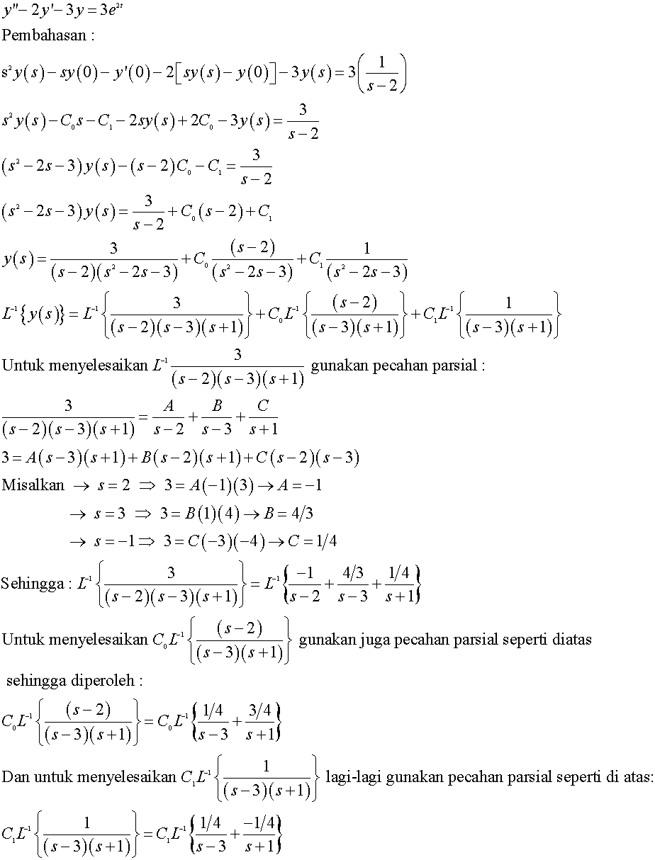 Review definisi dasar fungsi variabel turunanderivatif beberapa aturan pada operasi turunan latihan soal. Contoh soal transformasi laplace dan jawabandocx. Bila persamaan aljabar dalam dipecahkan maka penyelesaian dari persamaan diferensial transformasi laplace balik dari variabel tidak bebas dapat diperoleh dengan menggunakan tabel transformasi laplace. Turunan integral persamaan diferensial dan transformasi laplace dalam penerapannya di bidang teknik elektro. Pisahkan fs ke dalam pecahan pecahan parsialnya. Deny budi hertanto mkom.