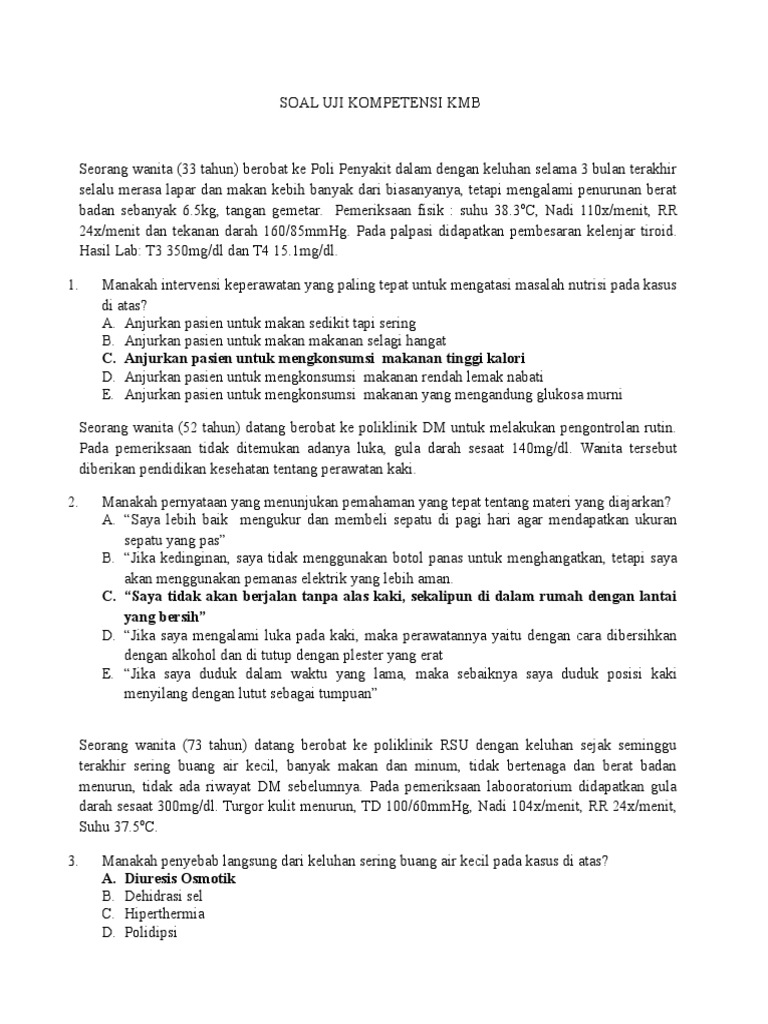 Contoh soal uji kompetensi keperawatan medikal bedah. Contoh file soal uts lengkap kelas 1 6 sdmi semua mata pelajaran 20162017 berikut ini adalah kumpulan dari berbagi sumber tentang contoh soal uji kompetensi keperawatan medikal bedah yang bisa gunakan untuk bank soaldownloadsd dan diunduh secara gratis dengan menekan tombol download biru dibawah ini. Guru sd smp sma contoh soal uji kompetensi keperawatan medikal bedah. Berikut ini saya menyajikan contoh kisi kisi soal uji kompetensi keperawatan stage keperawatan medikal bedah yang bersumber dari regional kalimantan terbaru hanya sekedar berbagi dan hanya untuk pembelajaran. Contoh soal uji kompetensi ukom kasus keperawatan medikal bedah kmb dan kunci jawaban berikut ini adalah latihan uji kompetensi perawat ukom kmb bagian ke 175 beserta kunci jawabannya serta pembahasannya hai halo teman teman semuanya apa kabar kalian yang dari sabang sampai merauke saya harap kalian baik baik saja yaa dan teteap fit serta semangat untuk belajar soal soal uji. Pasien masuk rumah sakit dengan riwayat telah menderita diabetes melitus selama 6 tahun terakhir dan terdapat luka pada telapak kaki kanan. Apakah pendidikan kesehatan yang sebaiknya diberikan oleh perawat sebelum pasien pulang.
