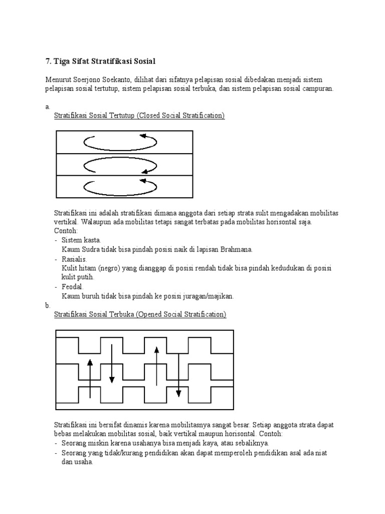 Contoh stratifikasi sosial terbuka. Sebagai contoh seorang masyarakat bisa bermutasi untuk bekerja sebagai pimpinan dan tidak memungkinkan untuk menjadi bangsawan atau tokoh dalam masyarakat. Stratifikasi sosial terbuka didalam stratifikasi sosial terbuka kela kelas sosial tidak tertutup artinya seseorang dapat saja masuk ke dalam kelas sosial tertentu yang diinginkan ataupun keluar setelah mencapai kelas sosial yang lebih tinggi. Stratifikasi sosial campuran biasanya terjadi dalam lingkungan. Berikut ini beragam contoh tentang bentuk stratifikasi sosial berdasarkan pada sifatnya antara lain. Sistem stratifikasi sosial terbuka ini memberi kemungkinan kepada seseorang untuk pindah dari lapisan satu ke lapisan yang lainnya baik ke atas maupun ke bawah sesuai dengan kecakapan perjuangan maupun usaha lainnya. Berdasarkan sifatnya stratifikasi sosial dibagai menjadi sebagai berikut.