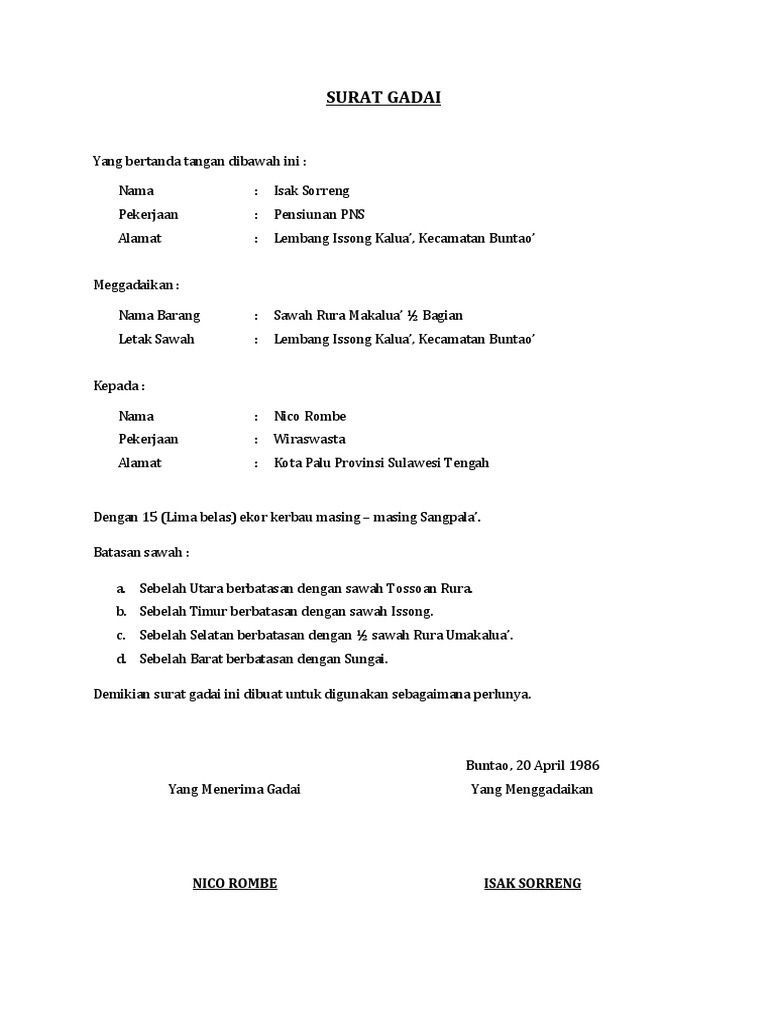 Contoh surat gadai sawah. Silahkan ambil contoh surat ini mungkin cocok dan pas untuk anda yang sedang ada urusan gadai tanahlahan. Contoh surat perjanjian gadai sawah diatas ditulis menggunakan kaidah penulisan yang resmi dan benar sehingga dapat dijadikan referensi jika akan membuat surat perjanjian mengenai gadai. Surat perjanjian gadai sawah diatas berisi tentang kesepakatan antara kedua belah pihak dengan menjadikan sawah sebagai barang jaminan untuk pemberian hutang. Contoh surat perjanjian gadai sawah diatas ditulis menggunakan kaidah penulisan yang resmi dan benar sehingga dapat dijadikan referensi jika akan membuat surat perjanjian mengenai gadai. Contoh surat perjanjian gadai sawah tutorial microsoft word perjanjian gadai sawah contoh surat perjanjian gadai rumah dengan 12 pasal surat keterangan gadai sawah. 45000000 empat puluh lima juta rupiah pada saat perjanjian ini di tandatangani.