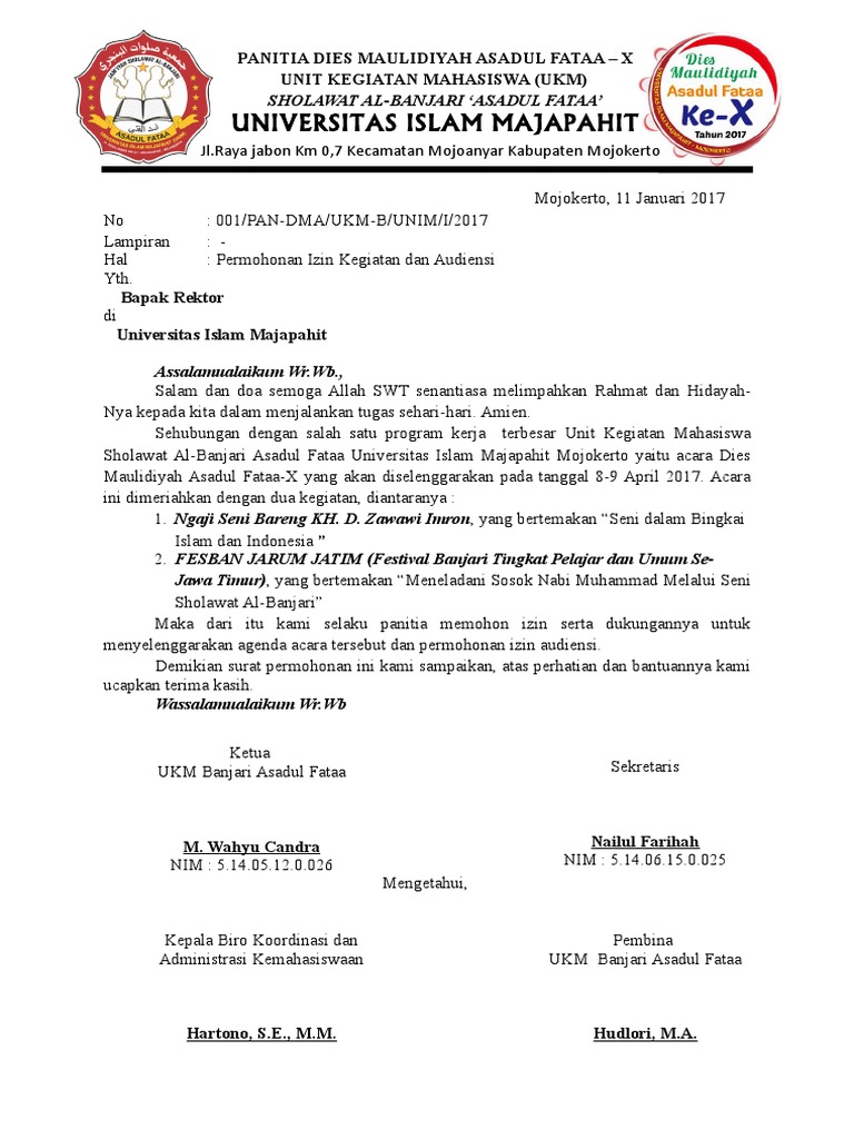 Contoh surat izin kegiatan kampus. Di kampus banyak sekali kegiatan mahasiswa yang terkadang membutuhkan surat izin baik izin dari pihak kampus rektorat izin orang tua ataupun mungkin juga surat izin dari kepala desa setempat bahkan rt rwsurat izin ini tentunya untuk mendukung lancarnya sebuah kegiatan yang akan dilaksanakan kepanitiaan kelompok mahasiswa organisasi kemahasiswaan. Contoh surat izin mengadakan kegiatan mahasiswa kepada dekan kemahasiswaan berikut ini adalah contoh tentang contoh surat izin mengadakan kegiatan mahasiswa kepada dekan kemahasiswaan seperti contoh yang ditulis berikut ini. Contoh surat permohonan izin seperti surat surat lainnya yang memiliki beragam jenis di sebabkan oleh tujuan pembuatan dan fungsi surat yang berbeda yang sebelumnya sudah di bahas di blog ini seperti surat permohonan bantuanpada kesempatan kali ini kami akan mencoba menulis surat permohonan izin yang pada intinya tujuan yang di miliki adalah sama yaitu isinya tentang pengajuan permohonan. Tata raya é 0411 864 936 fax. 15 contoh surat permohonan izin untuk berbagai kepentingan walaupun penggunaan surat belakagan ini sudah semakin menurun namun masih ada beberapa contoh surat yang tetap digunakan hingga sekarang. Contoh surat izin tidak masuk kuliah contoh surat izin kuliah seharusnya wajib dimiliki oleh tiap mahasiswa.