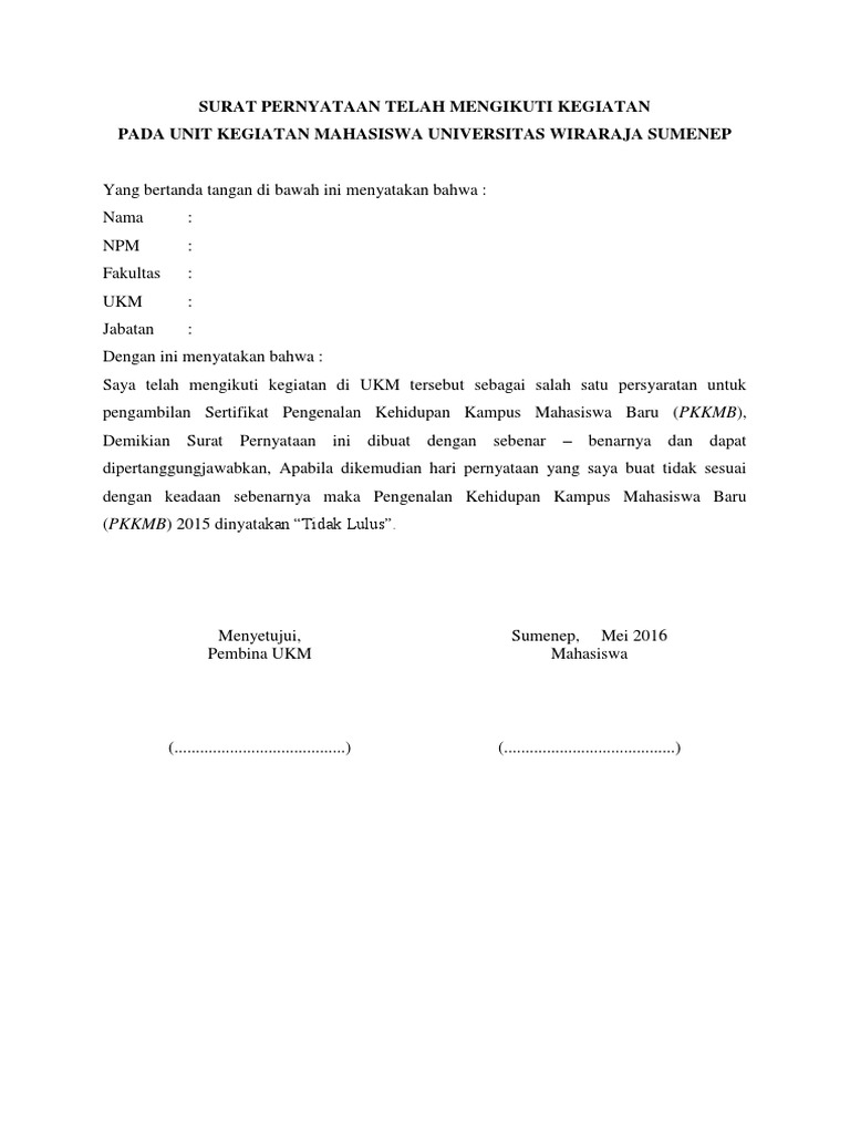 Surat keterangan kegiatan seminar. Tidak heran kalau sudah semakin banyak orang meninggalkan penggunaan surat sebagai media komunikasi. Perlu admin beritahukan bahwa portal website kumpulan contoh surat berisi contoh surat bisnis surat dinas surat izin surat kuasa surat lamaran kerja surat pemberitahuan surat penawaran surat pengunduran diri surat peringatan surat perjanjian surat pernyataan surat resmi surat undangan. Berikut ini adalah contoh tentang contoh surat keterangan partisipasi mengikuti kegiatan kemahasiswaan ukm kampus seperti contoh yang di tulis berikut ini. Bahwa benar adalah siswa siswa sdn apalah dan ditugaskan mengikuti perlombaan sepakbola mini dalam kegiatan o2sn. Yang bertanda tangan di bawah ini kepala.