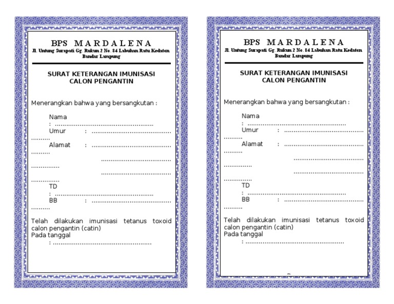 Surat keterangan sehat dari puskesmas setempat adalah surat yang didapat dengan melakukan vaksin ttd dan tes kesehatan di puskesmas yang telah ditunjuk tempat calon pengantin wanita tinggal. 1 maret 2011 0234. Penting untuk diingat pastikan selalu ada tanda tangan dokter pemeriksa dan ada cap basah dari puskesmas ya. Bentuk surat keterangan imunisasi suntik tt. Itulah mengapa saat mengurus berkas kita harus menyertakan surat keterangan suntik tt dari puskesmas. Atau jika membuatnya bukan di puskesmas misalnya di rumah sakit berarti harus ada cap basah dari rumah sakit tersebut karena untuk menunjukkan keaslian dari surat keterangan sehat ini.