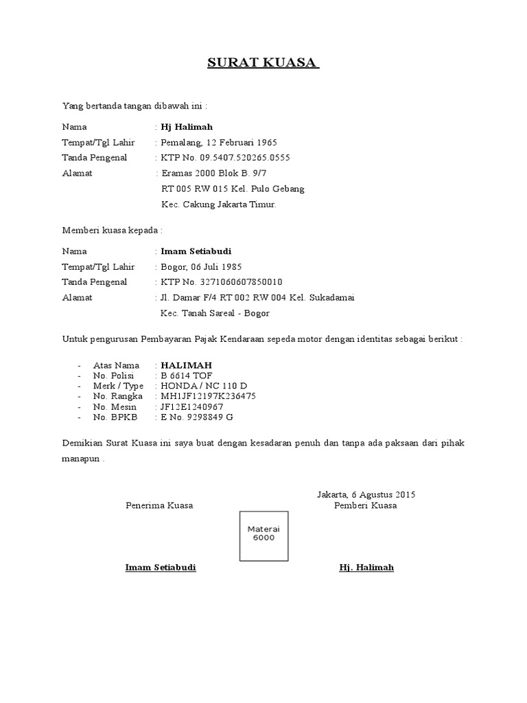 Contoh surat kuasa pajak. Ya mulai beberapa tahun terakhir ini setiap pembayaran pajak kendaraan bermotor baik itu sepeda motor maupun mobil tidak dapat diwakilkan pembayar berbeda identitas dengan identitas pemiliki kendaraan. Mohon maaf apabila terdapat kesamaan nama tempat atau informasi di dalam surat karena surat yang dibuat hanya untuk percontohan saja tanpa ada maksud apapun. Demikian contoh surat kuasa perpanjangan stnk yang baik dan benar sebagai referensi anda dalam membuat surat resmi yang profesional. Contoh surat kuasa pengurusan pembayaran pajak sepeda motor digunakan sebagai salah satu persyaratan dalam proses pembayaran pajak kendaraan bermotor jika pembayaran tersebut diwakilkan. Contoh surat kuasa pajak berdasarkan peraturan menteri keuangan republik indonesia nomor 229pmk032014 tentang persyaratan serta pelaksanaan hak dan kewajiban seorang kuasa terlampir format surat kuasa khusus yang dapat anda gunakan. Maka dari itu setiap pemilik perusahaan harus mendaftarkan perusahaanya masing masing untuk mengetahui besar pajak yang harus dibayarkan setiap tahunnya.