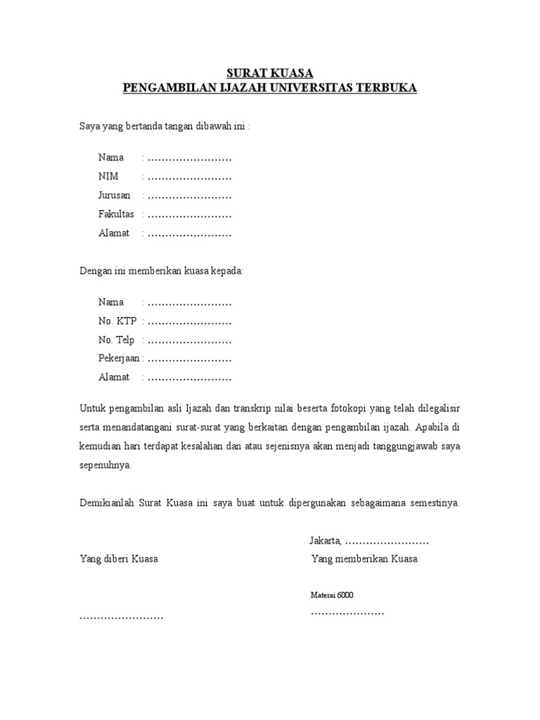 Walaupun anda menamatkan pendidikan sarjana namun jika tidak memegang ijazah maka. Surat kuasa pengambilan ijazah merupakan surat kuasa yang sifatnya individu atau perorangan sehingga tidak diperlukan kop atau kepala surat termasuk nomor surat sebagaimana menjadi bagian atau komponen penting bagi lembaga organisasi perusahaan atau instansi tertentu dalam mengeluarkan surat kuasa. Mungkin disebabkan karena anda sudah ada di luar kota untuk bekerja atau keperluan lain sebagainya.