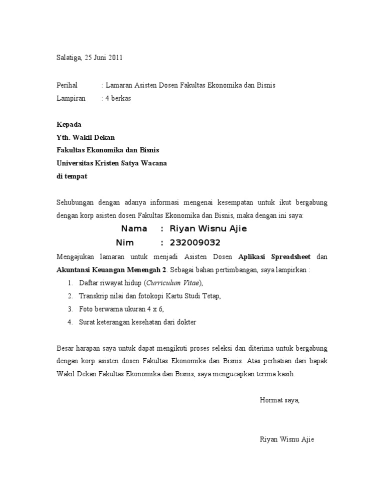 Contoh surat lamaran asisten dosen dan cv yogyakarta 21 februari 2017. Lamaran asisten praktikum lampiran. 1 satu berkas yth. Koordinator praktikum prodi akuntansi universitas ahmad dahlan yogyakarta dengan hormat berdasarkan informasi yang terdapat pada papan pengumuman.
